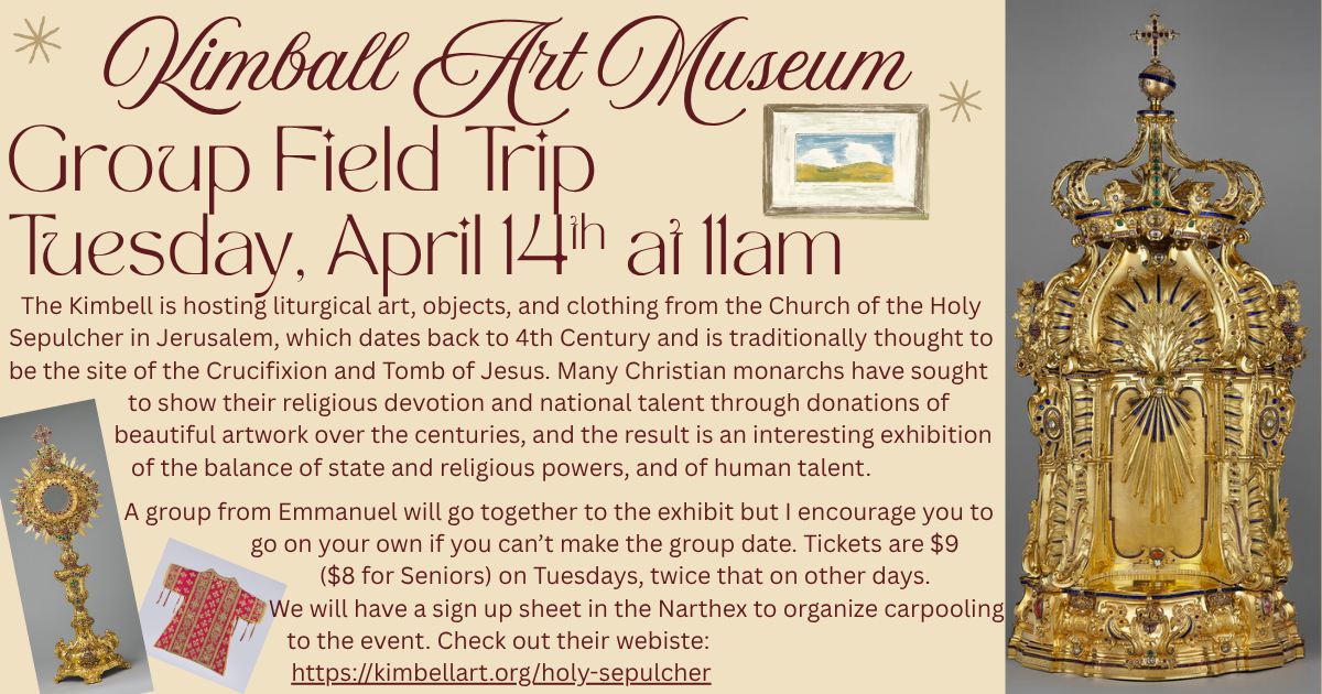 A group from Emmanuel will go together to the exhibit on Tuesday April 14th at 11, but I encourage you to go on your own if you can’t make the group date. Tickets are $9 ($8 for Seniors) on Tuesdays, twice that on other days. We will have a sign up sheet in the Narthex to organize carpooling to the event.